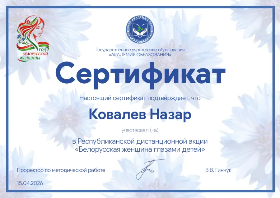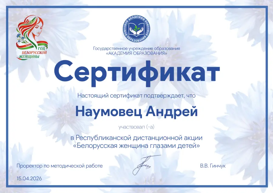 Наши воспитанники приняли участие в Республиканской акции "Белорусская женщина глазами детей", организованной ГУО "Академия образования". Мероприятие приурочено к Году белорусской женщины и проводится с целью популяризации роли белорусской женщины в семье и жизни общества и государства. Рисунки воспитанников опубликованы на национальном образовательном портале, официальных страницах портала в социальных сетях Facebook, "ВКонтакте" ГУО "Академия образования".